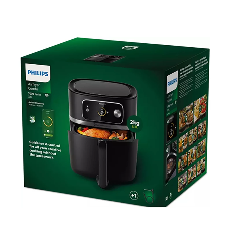 برنامههای پخت خودکار جدید فیلیپس، استرس آشپزی را در هنگام عجله از بین میبرد و تضمین میکند که برای بهترین نتایج بهطور یکپارچه در تمام مسیر هدایت میشوید. فقط مواد تشکیل دهنده خود را انتخاب کنید و مقدار آن را مشخص کنید و اجازه دهید Airfryer Combi بقیه کارها را انجام دهد. با اتصال Airfryer Combi خود به برنامه NutriU، با دستور العملهای خوشمزه، الهامبخش و سالم که از سرتاسر جهان تهیه شده است، غذاهای خوشمزه و بدون سر و صدا ایجاد کنید. دستور العمل ها با راهنمایی گام به گام و تنظیمات دقیقی که نیاز دارید به راحتی قابل بازسازی هستند. شما حتی می توانید دستورالعمل خود را آپلود کنید! در عین حال در زمان صرفه جویی کنید. استیک و سایر پروتئین ها را همانطور که دوست دارید بپزید، دماسنج غذا به شما کنترل کامل می دهد. جریان هوای کم را انتخاب کنید تا به آرامی استیک، سوسیس و خورش ها را آهسته بپزید و گوشت را سرخ کنید. امکانات پخت با جریان هوای زیاد، کم و پویا تضمین می کند که غذای شما همیشه لذیذ و در سطح تردی ترجیحی شما پخت می گردد. طراحی خلاقانه، تمیز کردن داخل Airfryer Combi را آسانتر از هر Airfryer دیگر موجود در بازار میکند و تمام قطعات قابل شستشو در ماشین ظرفشویی نیز هستند. پخت و پز دستهای یا درست کردن وعدههای غذایی برای بیش از 7 نفر اکنون با ظرفیت XXL 2 کیلوگرمی/8.3 لیتری، بزرگترین Airfryer فیلیپس، آسانتر و راحتتر از همیشه است. عملکردها:چند روش سرخ کردن – برشته کردن – گریل – چند روش پخت – تفت دادن – یخ زدایی – گرم کردن مجدد – گرم نگهدارنده – تست کردن – خورشت – تخمیر – آرام پز – انواع پخت ترکیبی و … با استفاده از این سرخ کن کم روغن و بدون روغن فیلیپس در مقابل اجاق گاز خود تا 70 درصد در مصرف انرژی صرفه جویی کنید و تا 40 درصد سریعتر بپزید.