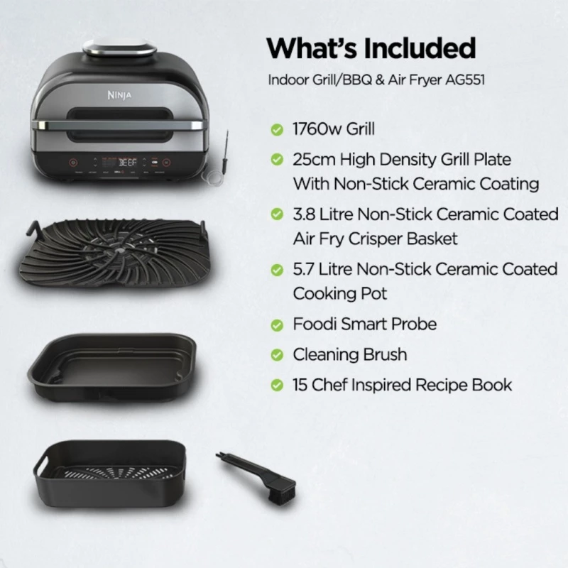 کبابپز Ninja Foodi Smart XL که چیپسها را سرخ میکند، میپزد و با تکنولوژی هواپز طبخ میکند. نسل دوم با طراحی شیک جدید با سیستم آشپزی هوشمند و ظرفیت XL، به وعدههای غذایی پرجمعیت خانواده با فشار دادن یک دکمه به پخت کامل، از rare تاwell done، دست پیدا کنید. گریل NINJA FOODI SMART با عملکرد ۶ در ۱ شامل:۶ عملکرد پخت و پز همه کاره ازجمله Grill, Air Crisp, Roast, Bake, Broil, and Dehydrate با طیف وسیع دما فعال شده است.از دیگر ویژگی های جذاب این دستگاه که آنرا تبدیل به یک انتخاب مناسب برای کسانی که وقت زیادی ندارند کرده ویژگی تمیز کردن آسان آن است صفحه گریل با روکش سرامیکی، قابل جدا شدن، سبد و قابلمه پخت و پز همگی قابل شستشو در ماشین ظرفشویی هستند و به راحتی تمیز می شوند. کباب پز با ظرفیت بالا که دقیقاً با نتایج عالی پخت می شود بیش از یک گریل –با ۶ عملکرد پخت: سرخ کردن با هوا، پختن، برشته کردن، گرم کردن مجدد، آبگیری و گریل کردن سیستم آشپزی هوشمند - کاوشگر پخت دیجیتالی به شما امکان میدهد بدانید چه زمانی غذای شما کاملاً پخته شده است، دقیقاً همانطور که دوست دارید، غذای سرخ شده تا ۷۵ درصد چربی کمتر نسبت به روش های سرخ کردنی سنتی می باشد ، شامل قابلمه ۳.۸ لیتری، سبد کری سپر ۳.۸ لیتری، بشقاب گریل ۷۴۰ سانتی متری مربعی، برس تمیزکننده، راهنمای دستور پخت آشپز است. قطعات قابل شستشو در ماشین ظرفشویی سیستم آشپز هوشمند کاوشگر پخت دیجیتال دقیقاً دمای غذای شما را در حین پخت نظارت می کند، بنابراین نیازی به این کار ندارید! از موارد کمیاب تا خوب انجام شده، پایان خود را انتخاب کنید و گوشت و ماهی مورد علاقه خود را با کاوشگر در جای خود بپزید. هشدارهای صوتی به شما اطلاع میدهند که چه زمانی آماده برداشتن و استراحت قبل از ارائه است. بیشتر از یک گریل با ۶ کارکرد پخت و پز - سرخ کردنی در هوا، پختن، برشته کردن، آبگیری، گرم کردن و گریل کردن، غذاها و میان وعده های خوشمزه را برای کل خانواده ایجاد کنید. بدون نیاز به تلنگر با فناوری Cyclonic Air. از یخ زده بپزید. بشقاب گریل بزرگ ۷۴۰ سانتی متر مربعی تا ۶ همبرگر مناسب است.