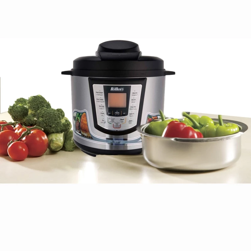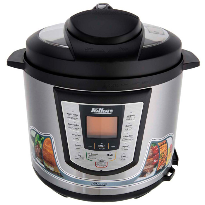 زودپز برقی «فلر» مدل «PC165» دستگاه همهکاره برای پخت غذا است. کافی است مواد غذایی را داخل آن قرار دهید تنظیمات را انجام داده و کمی صبر کنید تا غذا آماده شود. زودپز برقی فلر PC165 دارای تنظیمات گستردهای برای پخت انواع غذا در حالت بهینه مصرف است. با تنظیم میزان فشار در سه حالت کم، استاندارد، زیاد میتوان مقدار فشار داخل دستگاه را تنظیم کرد که با این عملکرد مدتزمان پخت هم تحت کنترل درمیآید. امکان استفاده از تایمر هم میتواند در این امر دخیل شود. تنظیمات پیشفرض برای پخت برنج با تهدیگ، تهیه ماست، پنیر، آبگوشت، انواع خورش، سوپ، حلیم، مرغ و گوشت، ماهیچه، حبوبات تنها با یک دکمه قابل انتخاب است. قابلیت پخت کیک و سرخ کردن هم در این دستگاه وجود دارد. این وسیله گزینهای بسیار مناسب برای تمام خانوادهها و حتی افراد تنها است که بهراحتی در وقت صرفهجویی میکند و نتیجه مطلوبی ایجاد میکند. امکان بسته شدن در زودپز بهراحتی انجام میشود و مکانیسم بست و باز آن طوری طراحیشده است که حتی با یک دست هم میتوان اقدام به باز و بست آن کرد. سوپاپ اطمینان و مکانیسمهای ایمنی این دستگاه، یک آشپزی ایمن را به ارمغان میآورد. بدنه این دستگاه از استیل ضدزنگ بوده و ظرف پخت این دستگاه روکش نچسب دارد و نگرانی از بابت چسبیدن مواد غذایی وجود ندارد. ظرفیت بالای این دستگاه امکان پخت برای خانوادههای پرجمعیت را هم فراهم میآورد. مصرف برق این دستگاه پایین است تا جایی که در رده مصرف انرژی B تا A قرار میگیرد. صفحه نمایشگر این زودپز اعداد و تنظیمات را باکیفیت و وضوح نمایش میدهد.