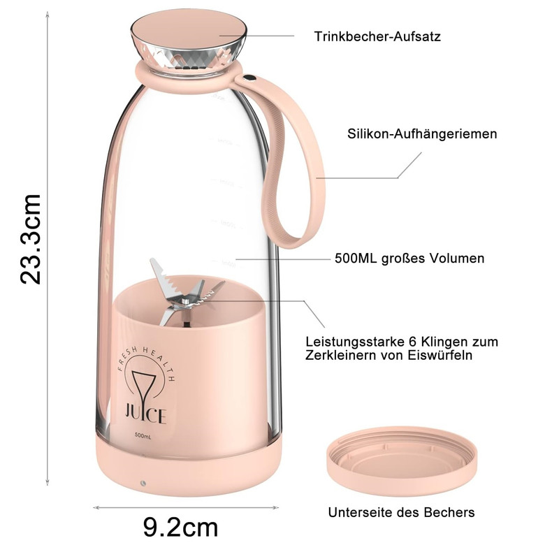 مخلوط کن قابل حمل مدل 500 میلی لیتر دستگاهی زیبا و کاربردی است که طراحی آن به شکل یک بطری آب با درپوش و دسته است. کمپانی سازنده این وسیله را در ابعادی معادل 22.5x9.2x9.2 سانتیمتر و وزن 741 گرم ساخته است. همچنین بدنه این مدل بلندر Fresh Juice از جنس پلاستیک مات ABS در رنگ های سفید، صورتی و مشکی به همراه فلز کروم است. در حالی که قسمت شیشه مانند این محصول جنسی از شیشه مقاوم و ضد خش دارد. این بطری همچنین یک بند سیلیکونی مایع دارد که به واسطه نرم و انعطاف پذیر بودن امکان جابجایی و حمل مخلوط کن را به آسانی فراهم می سازد. در ضمن این مدل آبمیوه گیری به راحتی خاموش و روشن می شود. در واقع تنها کافی است که شما شیکر را برعکس کرده و میوه های دلخواه و یخ را داخل مخزن 500 میلی لیتری آن بریزید. در نهایت پس از فشار دادن دکمه روشن و خاموش روی بدنه دستگاه، آب میوه و سبزیجات شما در سریعترین زمان ممکن آماده خواهد شد. دقت داشته باشید که سطح مواد و مایعات ریخته شده در بطری از خط نشان داده شده روی بدنه آن بالاتر نرود. این امر موجب افزایش طول عمر لوازم خانگی و یکدستتر شدن بافت نوشیدنی خواهد شد. قفل امنیتی تعبیه شده در این وسیله نیز امکان بروز هرگونه نشت نوشیدنی را در هنگام جابجایی آن غیرممکن می سازد. بدین ترتیب، شما به راحتی می توانید مخلوط کن و اسموتی ساز Fresh Juice Portable Blender 500ML را درون کیف قرار دهید. در این صورت، در هر مکانی از جمله محل کار و باشگاه می توانید از نوشیدن یک لیوان آب میوه تازه و دلچسب لذت ببرید.