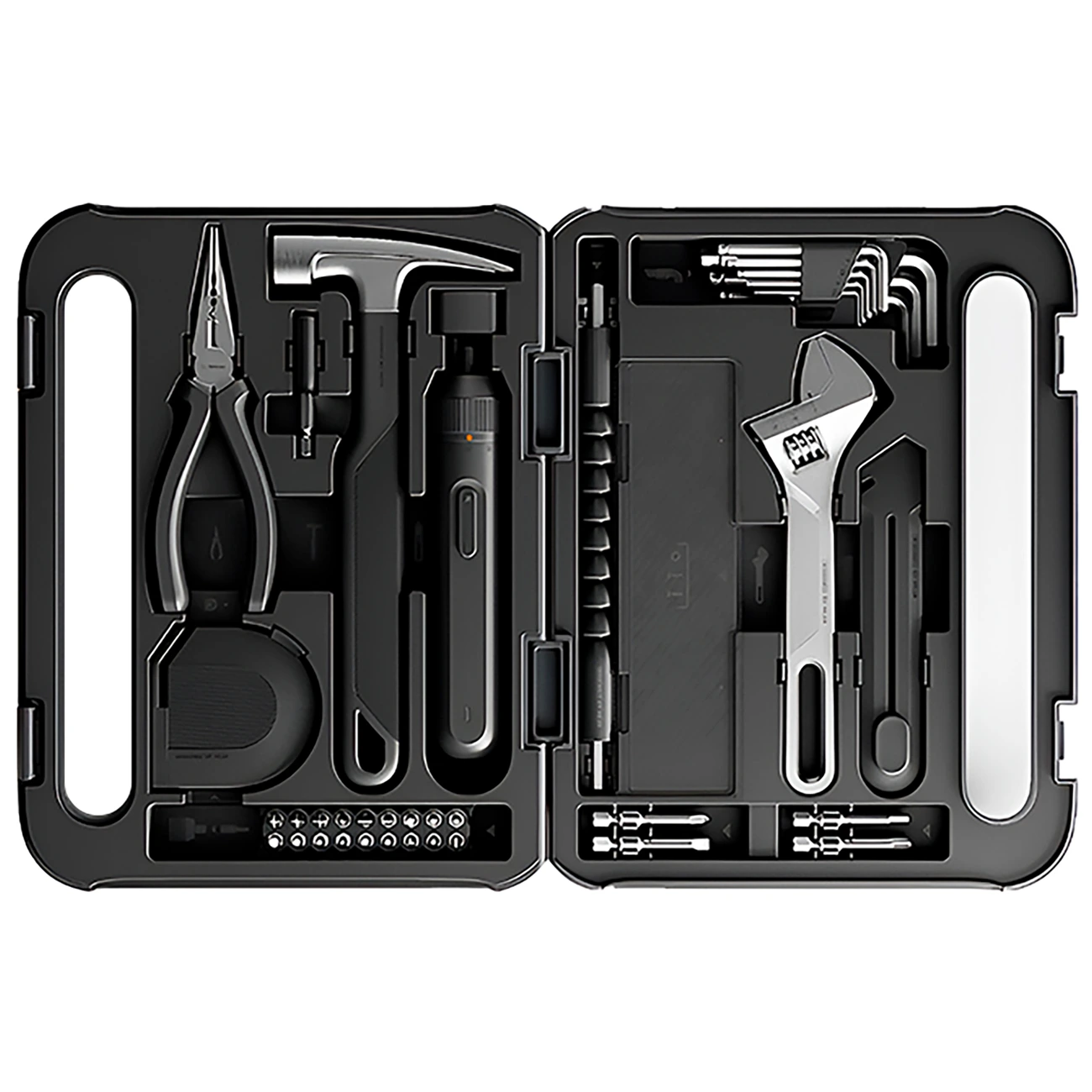 ابزارها شامل : آچار قابل تنظیم, انبردست, چکش پنجهدار, شامل پیچگوشتی الکتریکی, متر اندازهگیری و چاقوی کاربردی