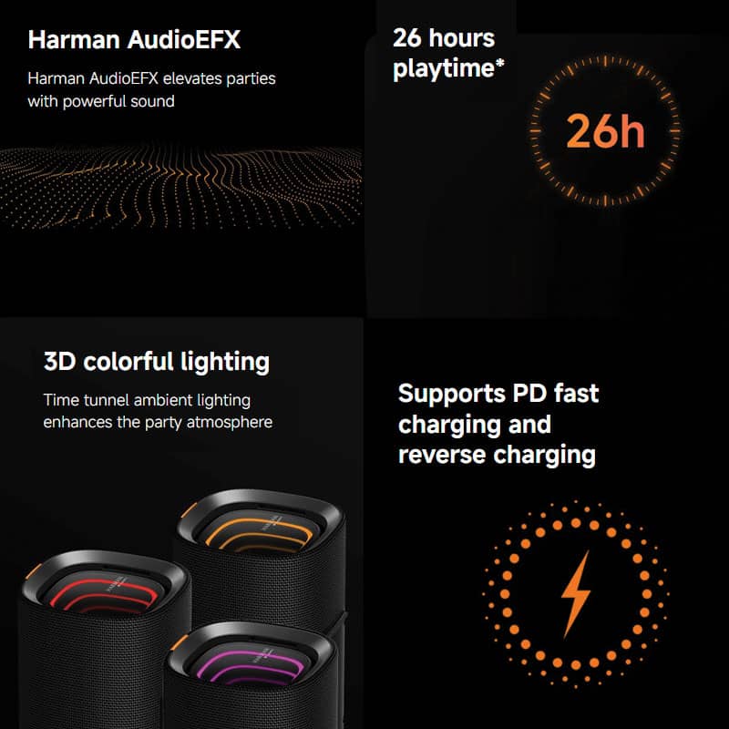 این اسپیکر با باتری لیتیومی ۵۲۰۰mAh تا حدود ۲۶ ساعت پخش مداوم در اختیار شما قرار میدهد و حتی میتواند به عنوان پاوربانک عمل کند. قابلیت اتصال همزمان به چند اسپیکر (Party Connect) و جفتسازی استریو (TWS) صدایی ۳۶۰ درجه و همهجانبه فراهم میسازد.