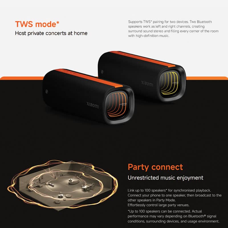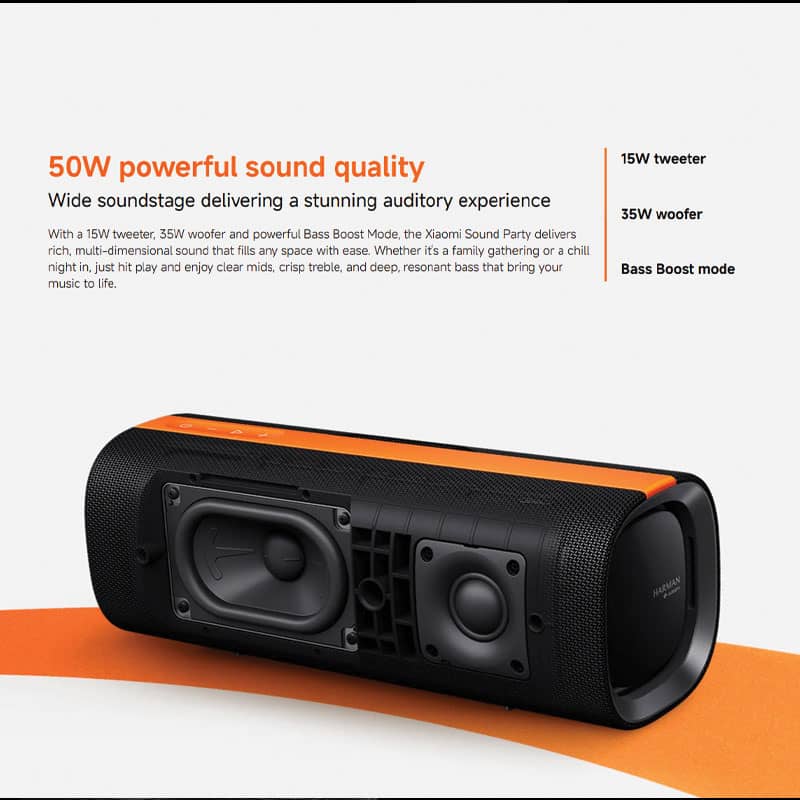 Xiaomi Sound Party یک اسپیکر بلوتوثی حرفهای با توان خروجی ۳۵ وات ووفر و ۱۵ وات توییتر است که تجربهای پرقدرت و شفاف از موسیقی ارائه میدهد. طراحی مدرن و مقاوم با استاندارد IP67 ضد آب و گردوغبار، آن را به گزینهای ایدهآل برای استفاده در خانه، مهمانیها و فضاهای بیرونی تبدیل کرده است.