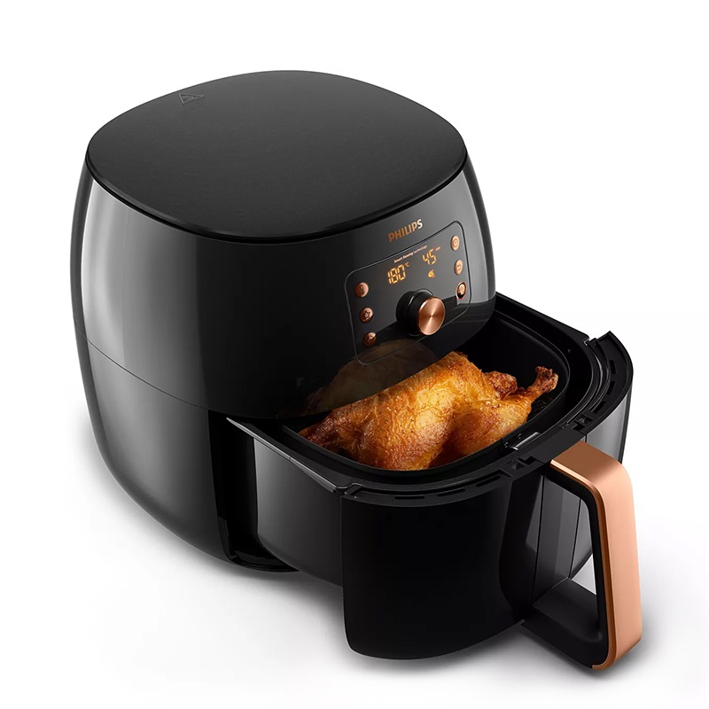 سرخ کن 9863 فیلیپس از توان مصرفی 2225 وات و ظرفیت 7.3 لیتر برخوردار است. و به کاربر امکان سرخ کردن سیب زمینی تا ظرفیت 1.4 کیلوگرمی یا یک مرغ کامل را می دهد.سیستم تشخیص خودکار در سرخ کن Philips HD9863 کمک می کند تا کاربر نوع غذا را مشخص کند، سپس دستگاه درجه دمای مناسب با آن را تشخیص دهد و بدین ترتیب بهترین طعم غذا را بچشید. همچنین وجود تکنولوژی هوشمند سر آشپز در آن به شما کمک میکند تا به صورت خودکار این سرخ کن نوع غذای شما را چه یخ زده و یا چه خام باشد تشخیص دهد و بر روی غذای شما تفکر کند و برای شما بهترین حالت غذا را بپزد.همچنین امکان ذخیره دما و تایمر مورد نظرتان برای هر غذایی ذر حافظه سرخ کن 9863 امکان پذیر است تا سرعت آشپزی برای شما بالاتر برود.همچنین سیستم هواپزی که در این محصول تعبیه شده است هفت برابر سریعتر از سایر سرخ کن های فیلیپس میباشد که سبب میشود غذایتان کاملا مغز پخت شود. همچنین میتوانید از این محصول چه با روغن و چه بدون روغن استفاده نمایید.یکی از قابلیتهای خوب سرخ کن فیلیپس مدل HD9863 این است که به شما این اجازه را میدهد تا هنگامی که غذایتان رو پختید تا 30 دقیقه بعد از آن تنها با فشردن یک دکمه غذایتان را گرم نگه دارید و با توجه به سیستم پخت و پزی که این محصول دارد به شما این اجازه را میدهد تا غذاها را 1.5 برابر سریعتر از دستگاه های آون بپزید.